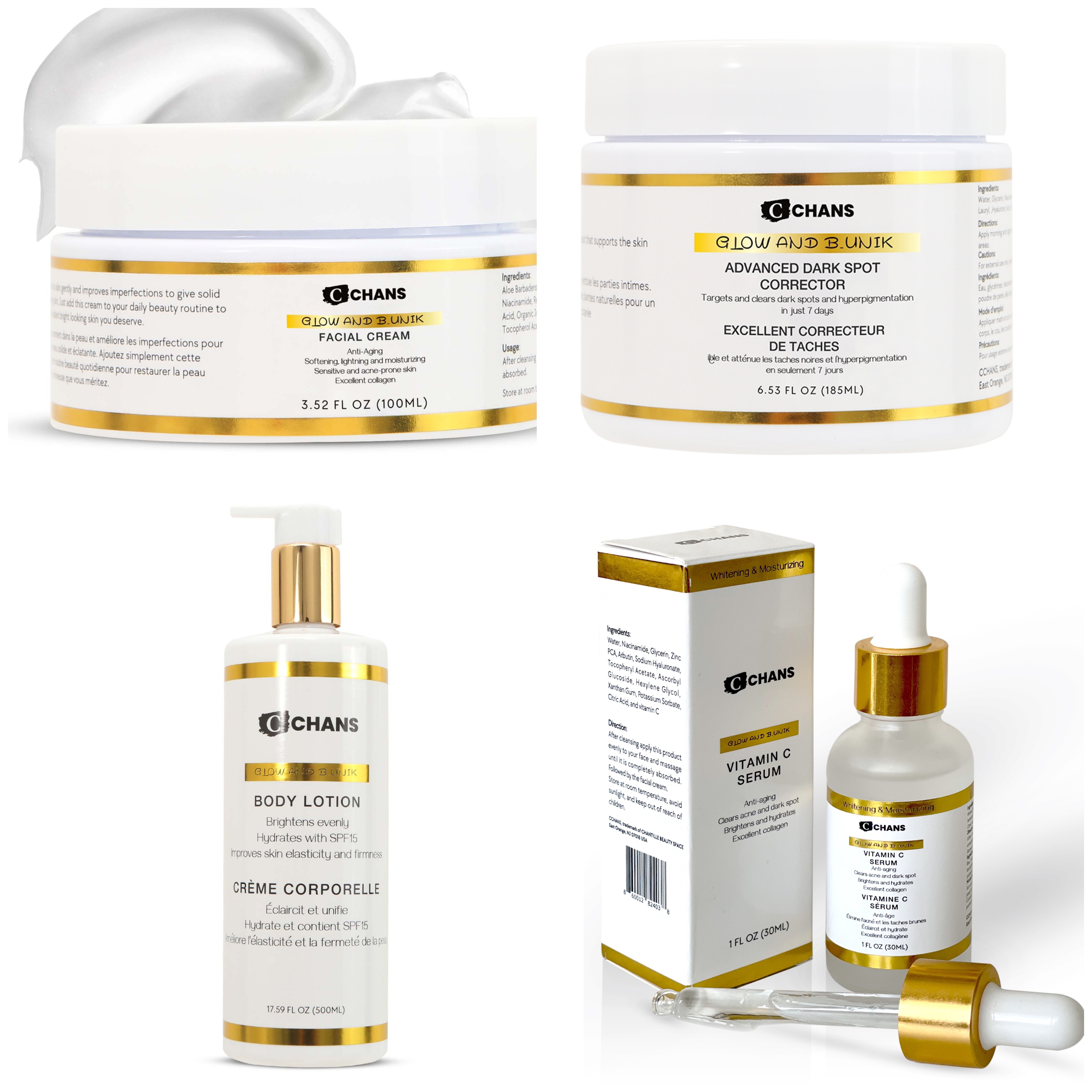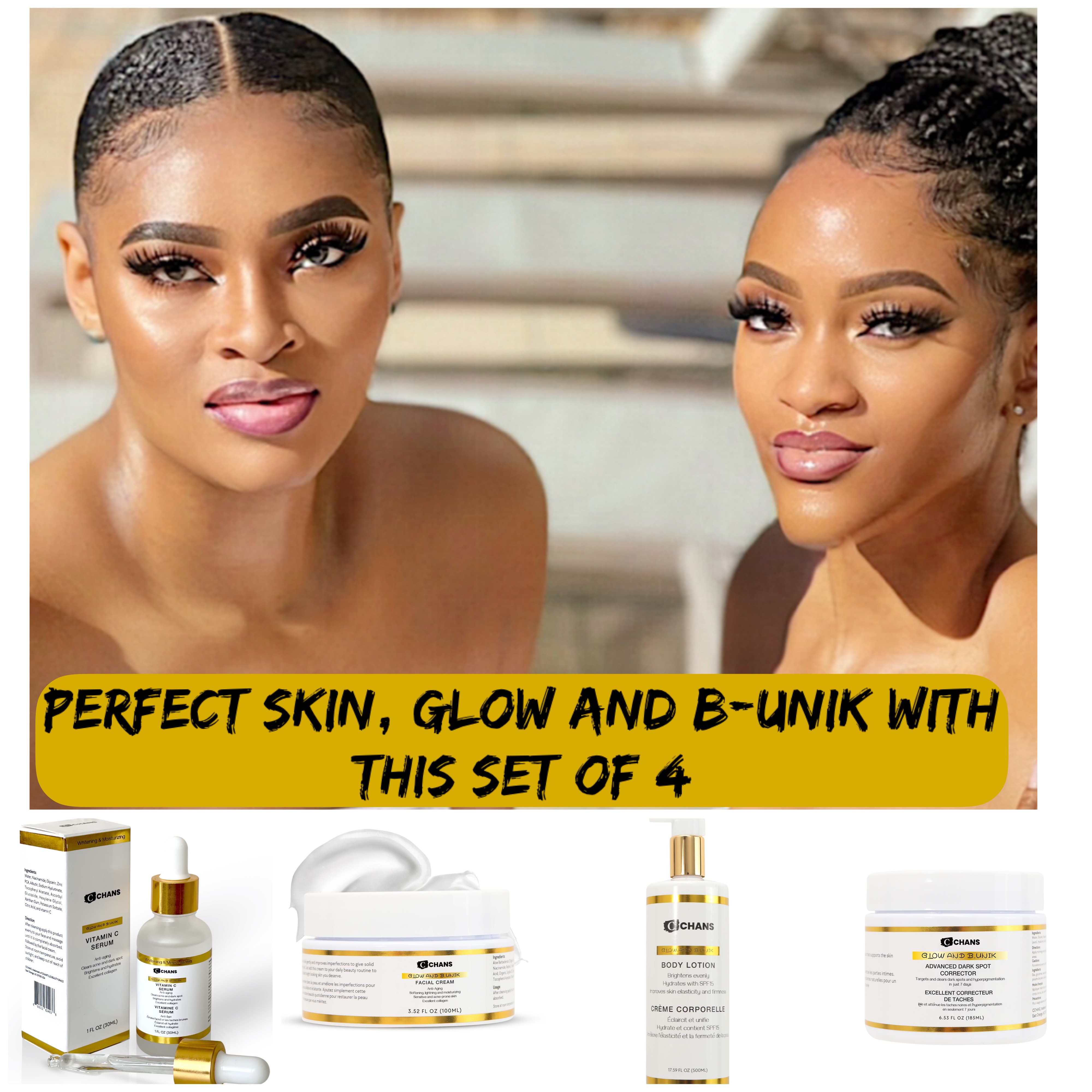CCHANS GLOW AND B_UNIK 4 PIECE SETS, BODY LOTION, FACIAL CREAM, SERUM & DARK SPOT CORRECTOR, High glowing skin solution, anti-aging, softening, lightening and moisturizing whole body and face combo. Formulated with skin-enriched organic brightening ingredients to neutralize free radicals, and boost collagen for the improvement and elimination of dark spots, sun damage, hyperpigmentation, and fine lines & wrinkles. Ideal for combination, oily, dry & Acne prone Skin types for all skin types
